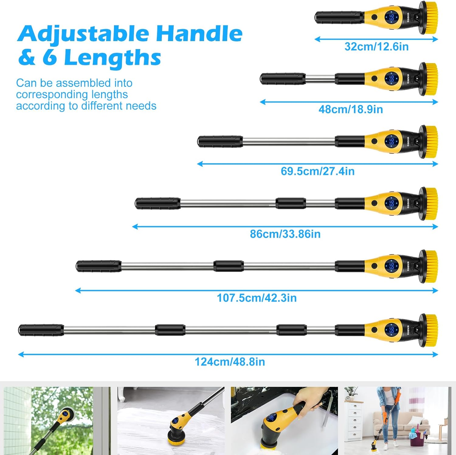- 【Adjustable Angle & Extendable Handle】electric spin scrubber comes with 3 removable handles that can be assembled into 5 different lengths (up to 48.8 inches) and two adjustable angles (45°,180°). Available in a variety of lengths to suit your needs, it helps you do housework with the most relaxed posture. Easy to use, easy to clean, saving you time.