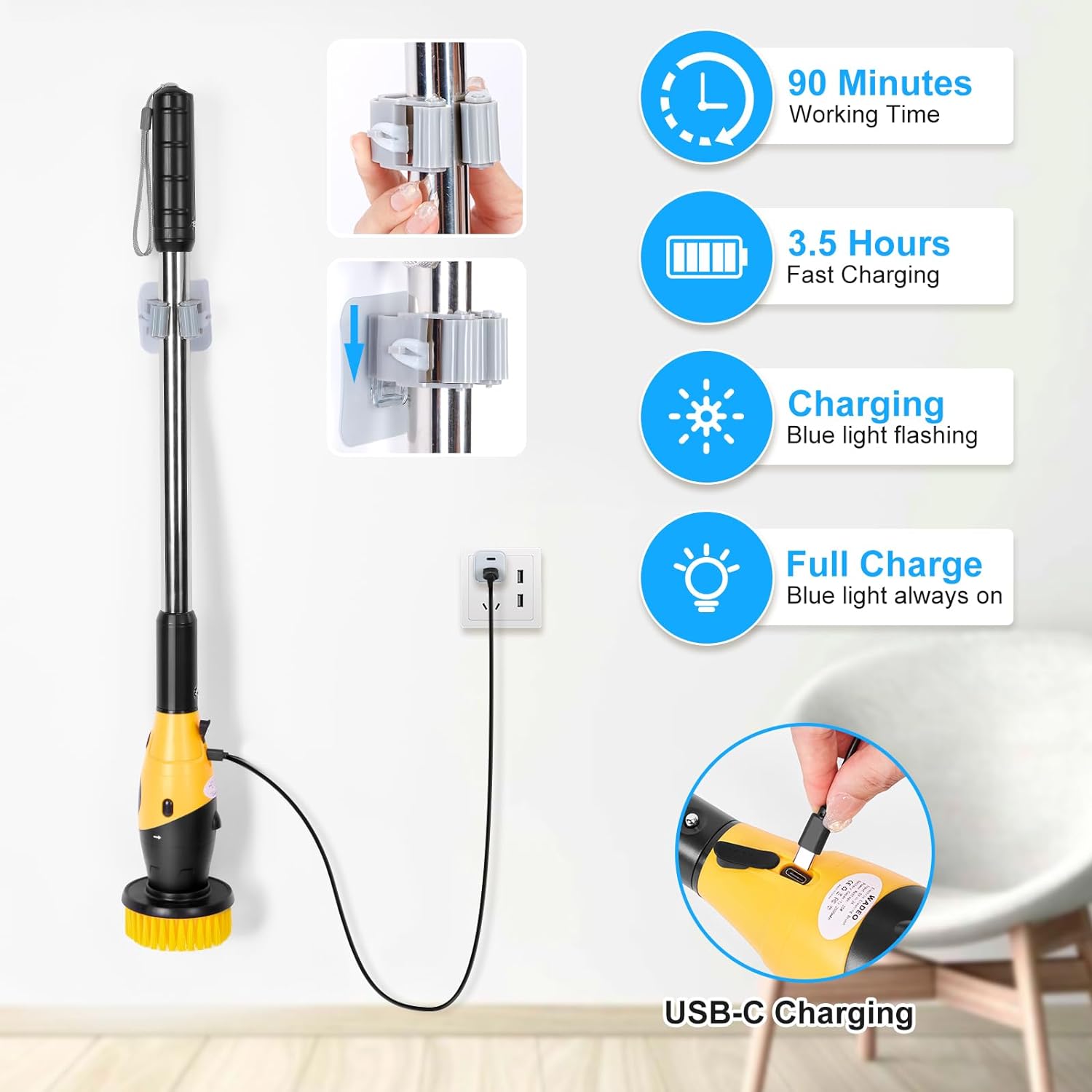 - 【Upgraded Electric Spin Scrubber】17 replaceable brush heads/3 powerful speeds (400/420/460RPM)/extension handle/adjustable angle/LED display/LED light/type-c charging port/90 minutes cordless working time/IPX7 waterproof. It can work continuously for up to 90 minutes after being fully charged. One charge can meet the deep cleaning needs of the entire bathroom 2-3 times.